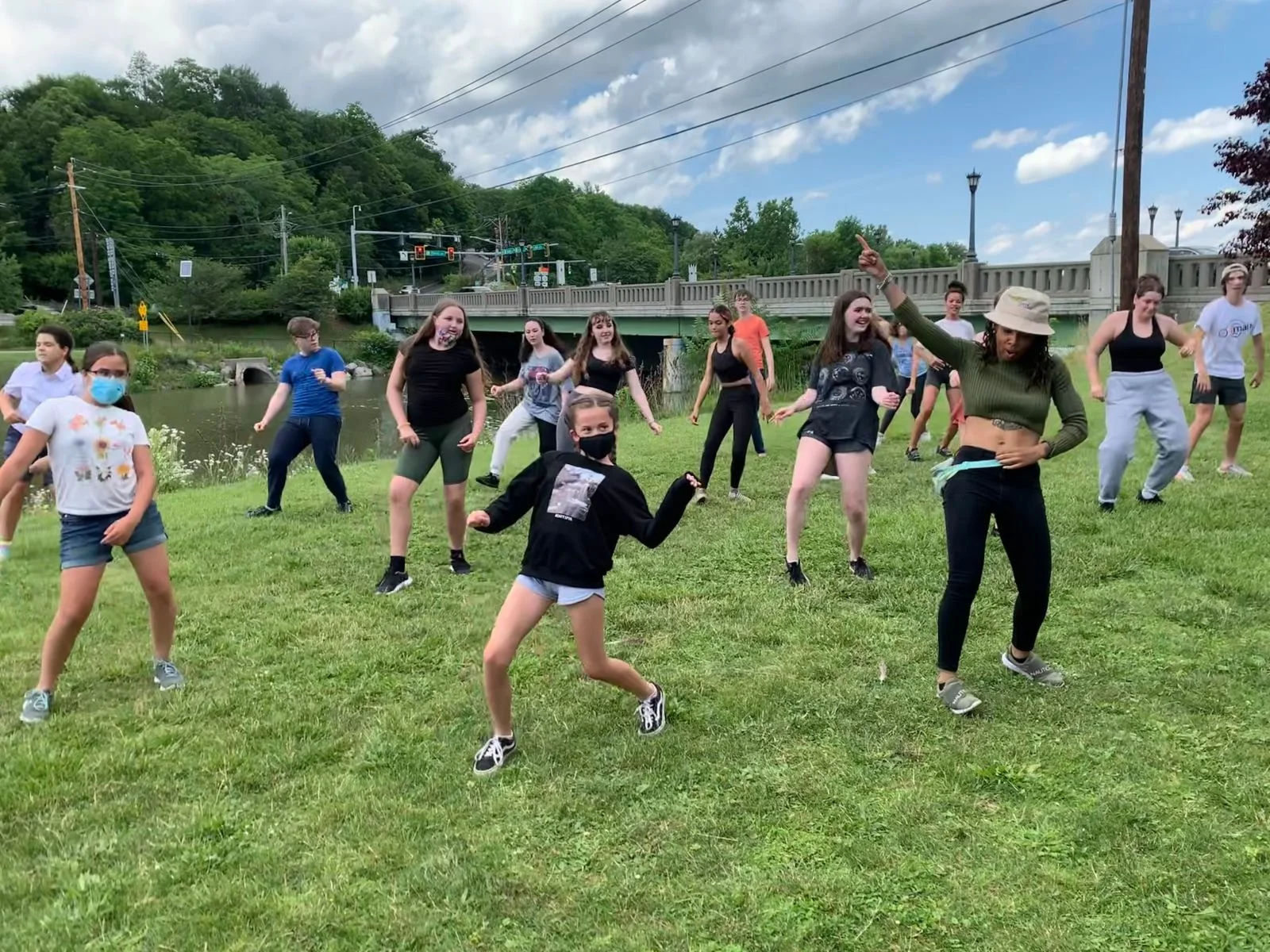 And because Summer Showcase was rehearsed and performed, well, in the summer, we were able to mostly rehearse in the fresh air on the patio of the Just Be Cause Center – our longtime home for office and rehearsal space, thanks to the vision and generosity of Jerry Dietz and his company CSP Management. We built a raised stage right there in the backyard along the beautiful inlet and invited audience members to bring camping chairs or picnic blankets so they could choose seating that matched their level of distancing comfort – as for many folks, this show was their first public performance in a year and a half.